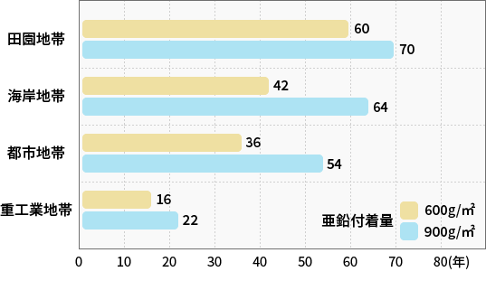 溶融亜鉛めっきは、その表面に形成される薄い緻密な保護皮膜と亜鉛特有の電気化学的防食作用によって大気中、海水中、土壌中、コンクリート中の使用環境のもとで長期間にわたり、鉄鋼製品を錆から守る働きをします。