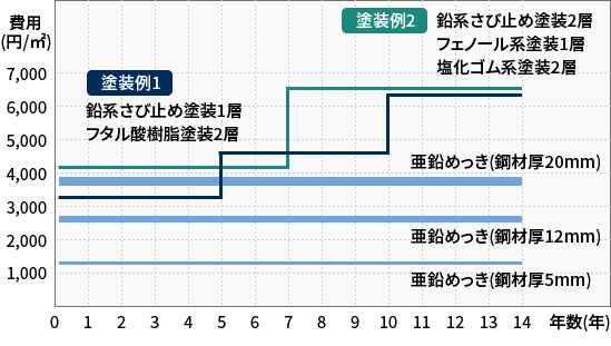 溶融亜鉛めっきと塗装とのコスト比較低コストで経済的溶融亜鉛めっきは、塗装等に比べて初期費用が高いというのが一般の通念となっていましたが、塗り替えなどのメンテナンスの必要がなく、 長期的なランニングコストを考えると、たいへん経済的な防食方法です。
