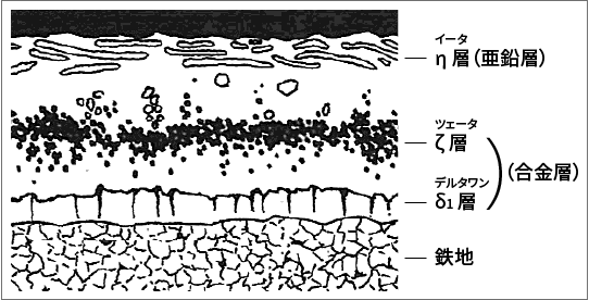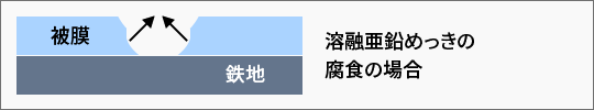 溶融亜鉛めっきは鉄の上に密着性のよい連続した被膜をつくり、外部の腐食環境から鉄を遮断する遮閉帯としての作用を果たします。また、腐食が始まり被膜部分が破れても、亜鉛めっき部分が自らの犠牲によって鉄地の腐食を防ぎます。